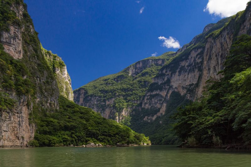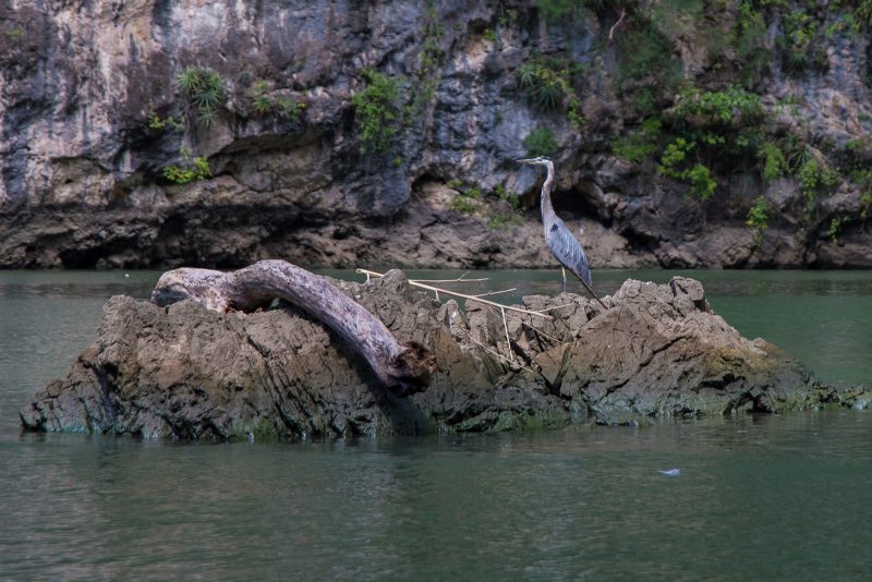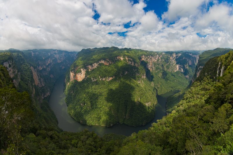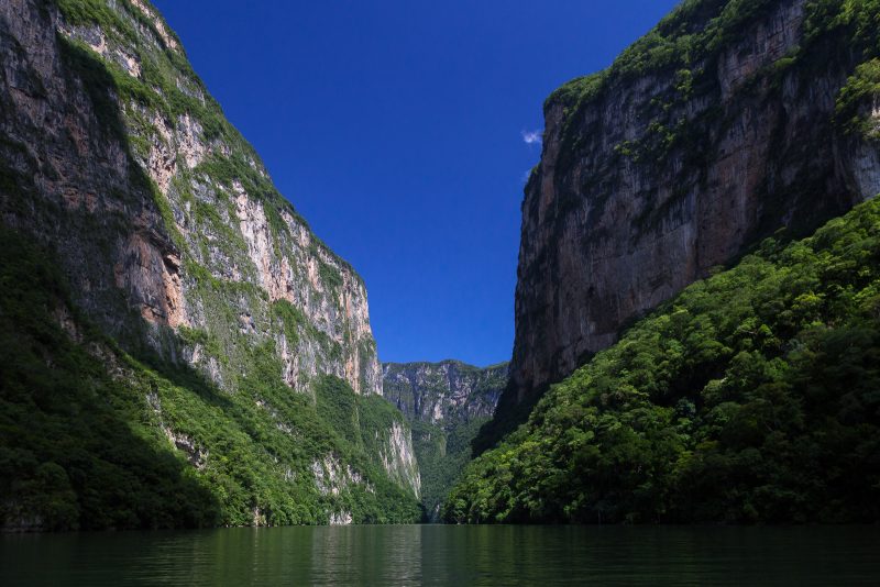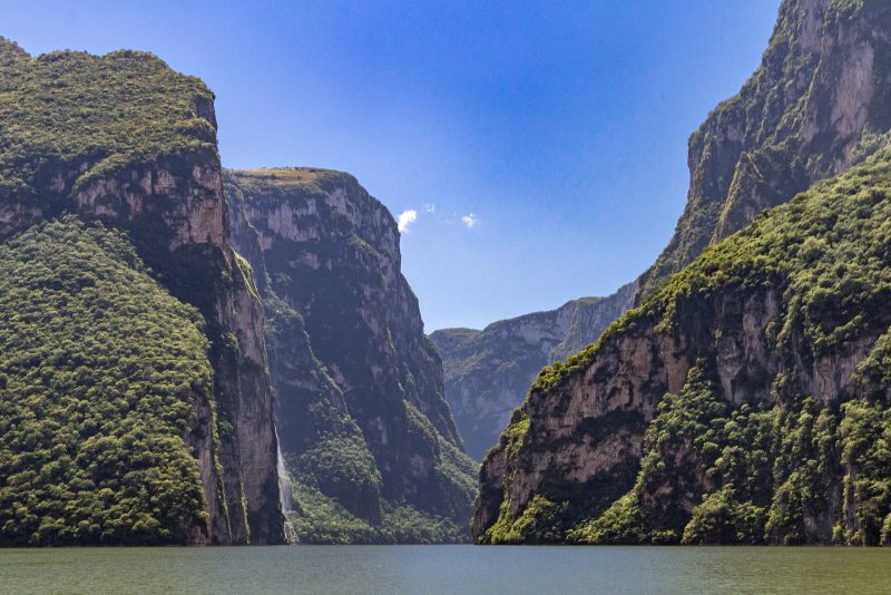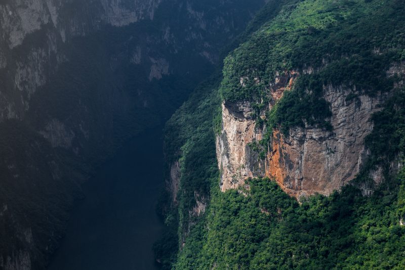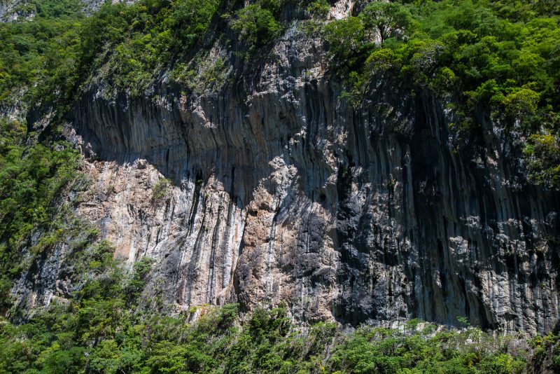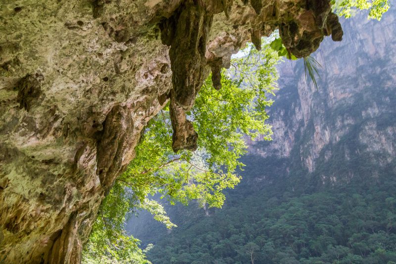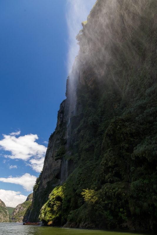 Was für ein wunderbarer Ort… Alle Welt kennt den Yosemite NP im Westen der USA, den Cañón del Sumidero kennt niemand. Naja, fast niemand. Wer aber einmal dort gewesen ist wird diese Schlucht und den zugehörigen Nationalpark sicher nicht so leicht vergessen. Bis zu 1000 Meter ragen die Kalksteinwände senkrecht vom Fluss empor. Natürlich suchen unsere Augen hier Spuren von Begehungen, Kletterbegehungen natürlich. Aber nichts, rein gar nichts ist zu sehen – weder von oben, vom Rand des Canyon noch von unten, vom Boot aus. Alles unberührt, allein der Natur scheint es erlaubt, sich hier gestalterisch auszutoben. Ja, und wie! Ein Kaskaden-Wasserfall, dessen Wasser sich beim Durchfahren über uns zerstäubt, und das Sonnenlicht zu endlos vielen Regenbögen bricht. Höhlen, in die das ganze Boot hineinpasst, deren Eingang jedoch nur aus nächster Nähe zu sehen ist. Dazu kommt eine einzigartige Flora und Fauna, von der wir leider nur einen Bruchteil zu sehen bekommen. Krokodile und Reiher gehören dazu, während für uns Pelikane, Kormorane, Weißwedelhirsche und viele andere Arten mehr in diesem 20.000 Hektar großen Areal unsichtbar bleiben.