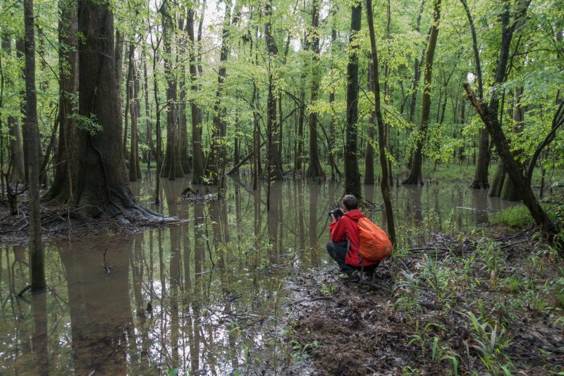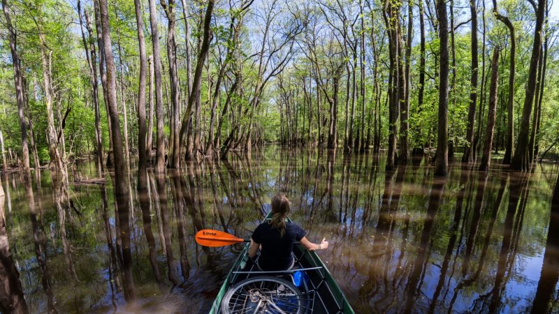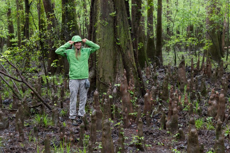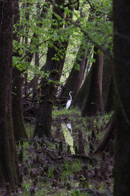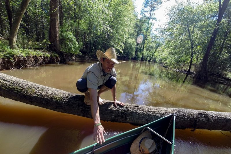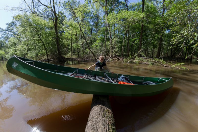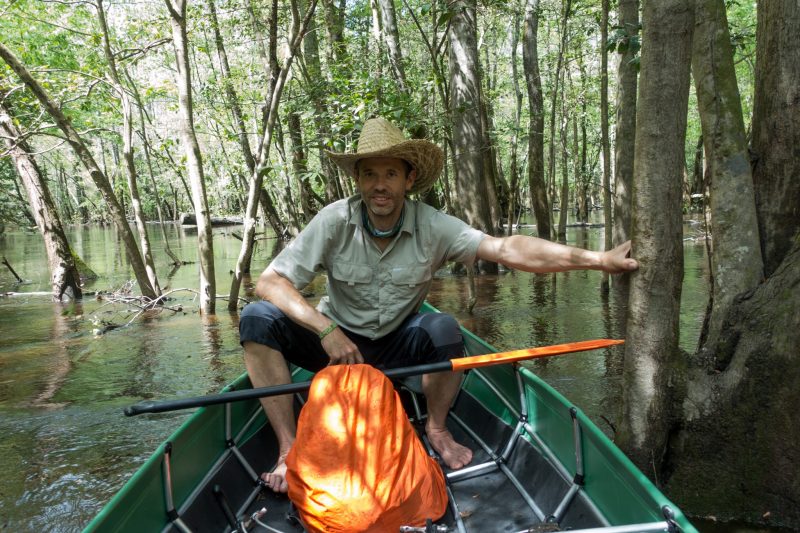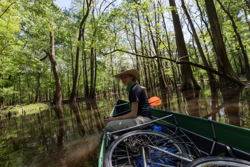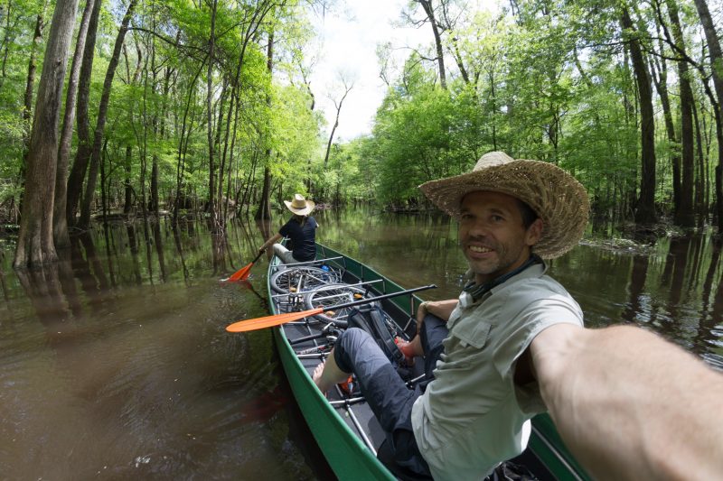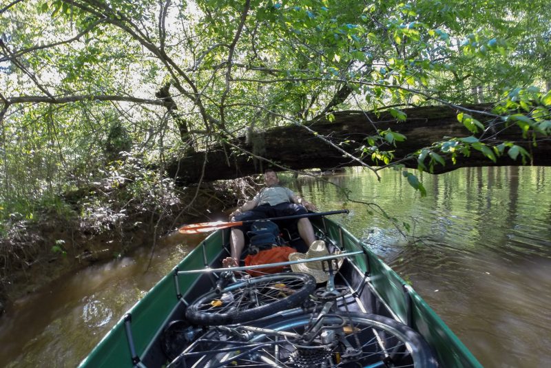 Für uns war es eine sehr schöne Station auf dem Weg in Richtung Küste. Wir hatten am Morgen die Gelegenheit den Park im Regen zu bewandern und am Nachmittag auf dem Cedar Creek zu durchpaddeln. Natürlich hatte beides seine Reize, wobei wir uns hier einig sind: Das Paddeln auf dem zum Auengebiet des Congaree gehörenden Cedar Creek war unser Highlight. Der Fluß ist naturbelassen und war teilweise durch den hohen Wasserstand eine Herausforderung was Navigation und Fortbewegung an sich betraf. Einige Portagen mussten gemeistert werden, an anderen Stellen wiederum war kaum ein Weg zu finden – kaum Strömung und unzählige Sackgassen könnten bei noch etwas mehr Wasser im Creek ein nahezu undurchdringbares Labyrinth erschaffen. Die Kombination mit dem Fahrrad im Boot hat sich auf jeden Fall bewährt – während Julia das Kanu 6 Milen flußabwärts wieder zerlegt, radele ich 10 Milen zurück zum Bus und pünktlich zum Sonnenuntergang ist alles wieder verladen und wir lassen uns eine leckere Gemüsepfanne schmecken. Toller Tag!