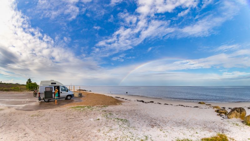 Von einer „leckeren“ Episode unserer Reise möchte ich natürlich auch noch berichten. Beim Durchfahren eines kleinen Fischerdorfs (Panacea) und im strömenden Regen sahen wir mal wieder so einen kleinen Seafood Laden… 10 Minuten später saßen wir mit tropfenden Sachen, nassen Haaren aber dafür auch mit insgesamt 1,5kg Shrimps, Langusten und etwas Fisch wieder im Ducato. Die Langusten (Crawfish) waren frisch zubereitet – und ihr dürft Euch jetzt gern vorstellen, wie wir darüber hergefallen sind, während sich vor uns über dem Meer von Mashes Sands ein toller Regenbogen zeigte.