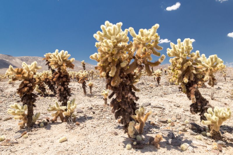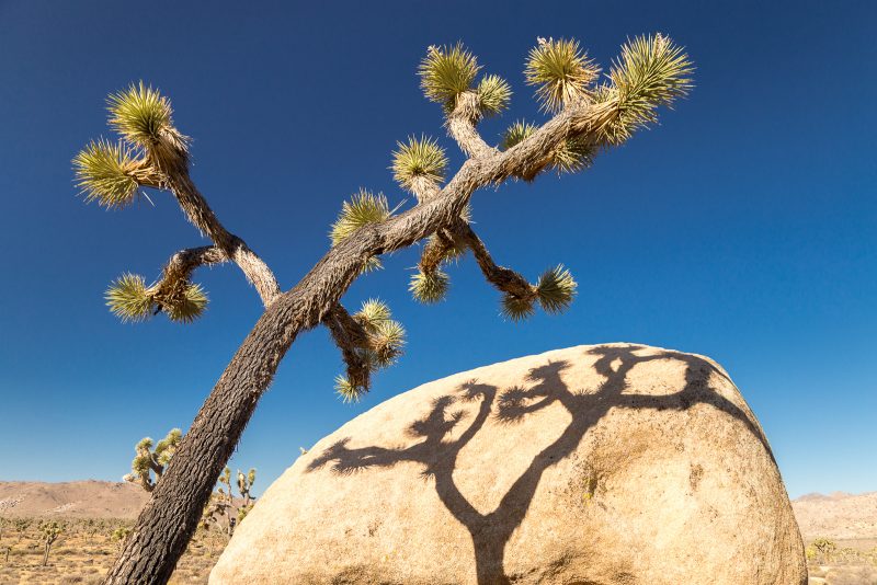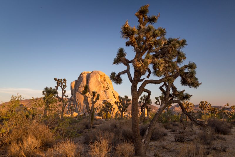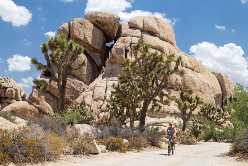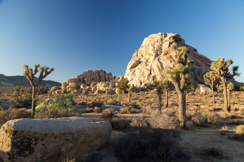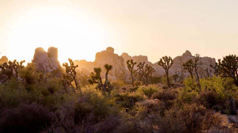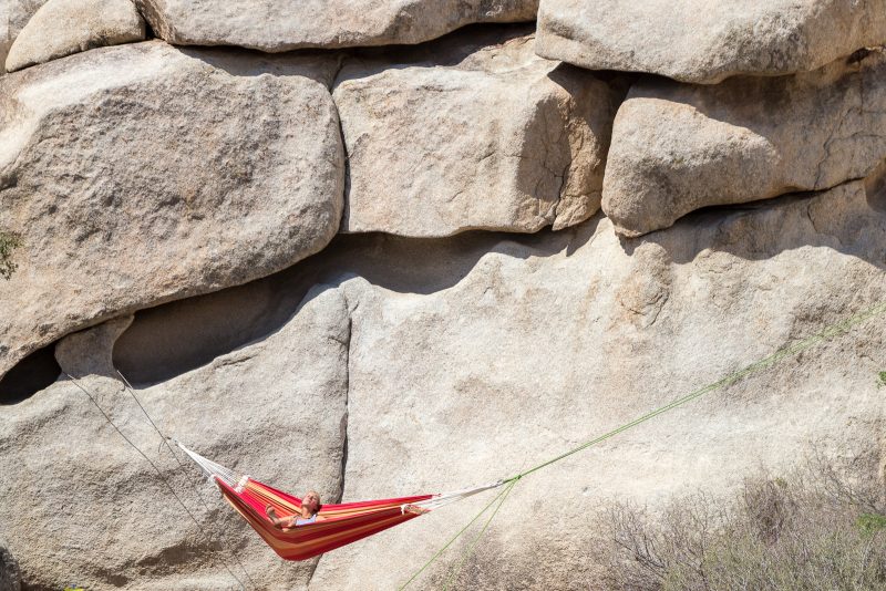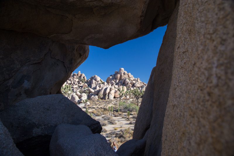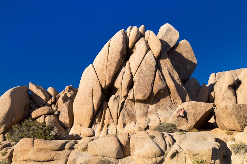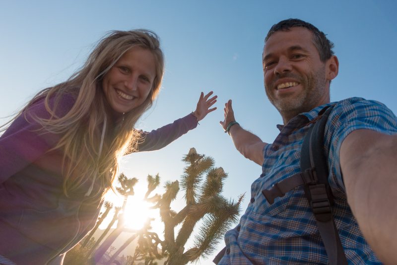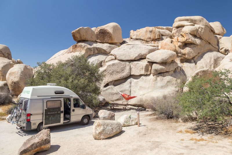 Skurrile Bäume, coole Felsformationen und glühend heiße Umgebung, beschreiben am besten den Joshua Tree National Park. Da hier nicht nur eine, sondern gleich zwei Wüsten – die Mojave und die Colorado – aufeinander treffen, ist es nicht verwunderlich, dass im Sommer die Temperatur bis über 50 Grad Celsius ansteigt. Mit unserer Besuchszeit im Juli, war dementsprechend nicht einmal an klettern zu denken. Doch immerhin konnten wir die sandfarbenen Granitblöcke auf dem Hidden Valley Campingplatz nutzen, um unsere Hängematte zu verspannen. Von diesem Campingspot starteten unsere kleinen Touren mit dem Fahrrad zu den bizarren Joshua Trees, die eigentlich gar keine Bäume sind, sondern eine Agavenart. Vor allem zum Sonnenauf- und -untergang wirken sie besonders mystisch und eindrucksvoll. Das war auch die Zeit für uns, wo dieser Glutofen am erträglichsten war!