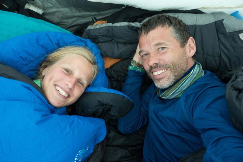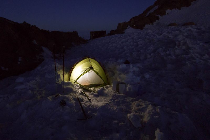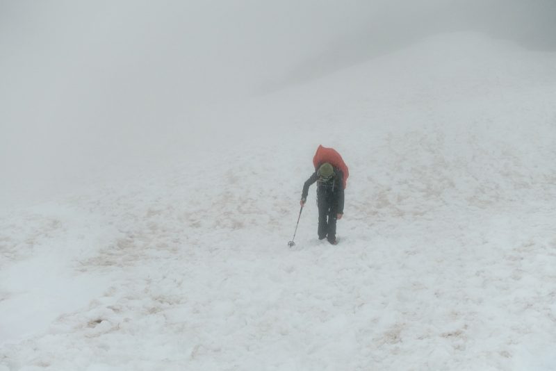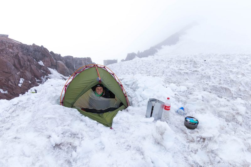 Am zweiten Tag machten wir uns auf zum Camp Muir. Aufgrund von begrenzten Schlafmöglichkeiten waren wir voll bepackt mit u.A. Zelt, Schlafsäcken und Kochutensilien. An diesem Tag war der Himmel immer noch mit grauen Wolken bedeckt und gestattete uns keinen einzigen Blick auf unser Ziel. Als wir gegen späten Nachmittag endlich im Camp Muir angekommen waren, war ich (Julia) völlig platt. Mark machte sich schnell dran das Zelt aufzubauen, inklusive vorher erstmal eine ebene Fläche zu schaufeln. Nachdem viel Wasser mit dem Kocher geschmolzen wurde, gab’s „gesunde“ Asianudeln und „leckere“ Tütenkäsenudeln. Wir gingen früh schlafen und stellten uns den Wecker auf 4 Uhr.