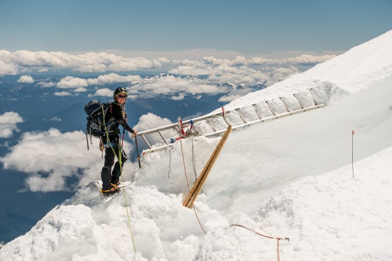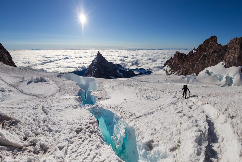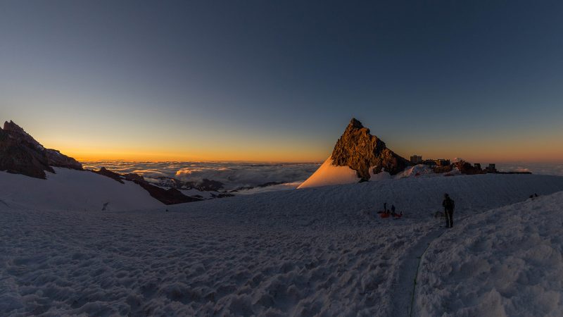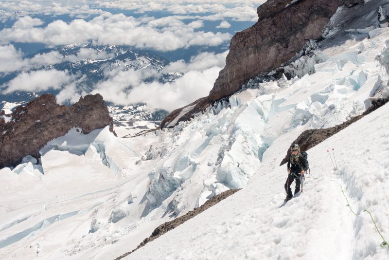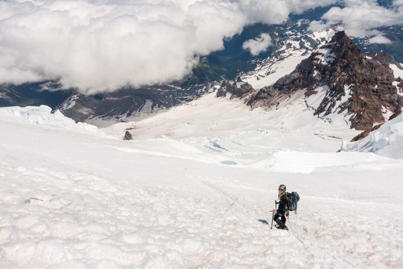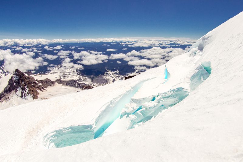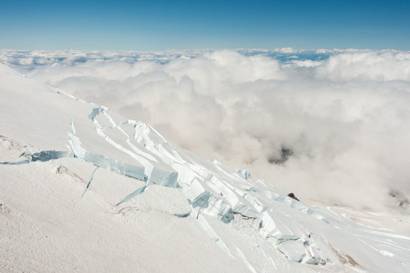 Anmerkung von Mark: Der MOUNT RAINIER ist eine ganz andere Liga als die hohen Berge in Colorado. Erstens schleppst Du sämtliche Ausrüstung inkusive Campingzubehör bis hoch zum Camp Muir, was alles andere als ein schönes Fleckchen ist und zweitens sind allein die objektiven Gefahren am Rainier nicht von schlechten Eltern. Die zu überquerenden Spalten sind dabei auf jeden Fall die geringsten, auch wenn einzelne von Ihnen so breit sind, dass sie mit Leitern präpariert wurden. Viel gefährlicher sind die Querungen unter den Serac-Brüchen und den Steinfeldern auf unserer Tour (der „Disappointment Cleaver“). Gerade die vielen geführten Seilschaften stellen im Bereich des Disappointment Cleaver eine große Gefahr im Auf- und Abstieg dar. Selbst wenn man sehr konzentriert über den losen Schotter nach oben klettert ist es auch für erfahrene Alpinisten fast unmöglich dies zu schaffen ohne Steine loszutreten. Die Seilschaften darunter tragen also immer ein sehr hohes Risiko „getroffen“ zu werden. Ist dieser Abschnitt geschafft, wartet der Rainier mit seiner langen steilen zermürbenden Flanke, die sixch schier endlos bis zum Kraterrand hinaufzieht. Hier heißt es Zähne zusammenbeißen und einen Schritt vor den anderen zu setzten. Klar, es hat auch hier Spalten, aber wenige davon sind verdeckt oder als wirklich gefährlich einzustufen.