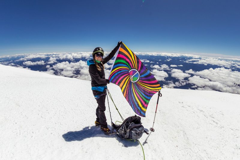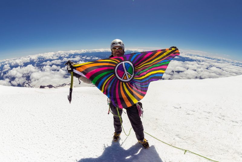 Am nächsten Tag ging es dann frühs um 5 Uhr los. Vorher gab’s Frühstück. Dadurch das Eis schmelzen viel Energie verbraucht und wir unseren Topf vom Vortag nicht wirklich abwaschen konnten, gab’s Haferbrei mit ranzligen Chemiekäse- und Sojasaucengeschmack – wüürg! Auch das Trinkwasser für unterwegs musste im selben Topf geschmolzen werden und bekam ebenfalls diesen besonderen Geschmack! Nicht gerade die beste Grundlage für so eine große Unternehmung. Wir ließen uns natürlich nicht davon abhalten und marschierten zielstrebig mit langsam aufgehender Sonne los. Die ersten paar hundert Meter gingen für mich sehr mühsam. Müdigkeit, flaues Gefühl im Magen vom „Frühstück“ sowie der Aufstieg vom Vortag zum Camp waren die Ursache. Die Aussicht auf den Sonnenaufgang über den Wolken gab mir wieder ein bisschen neue Kraft – das war einfach unglaublich! Trotzdem war mein Blick doch die meiste Zeit konzentriert auf meine Füße gerichtet. Mir kam es so vor, als ob ich nicht bzw. nur sehr langsam vorwärts kommen würde. Einen Schritt nach dem Anderen wie in Zeitlupe die steilen Hänge hinauf. In meinen Kopf war ein Kampf mit mir selbst – aufgeben und zurück nach unten oder weiter gehen, nach oben zum Gipfel. Ich entschied mich für’s Weitergehen. Langsam aber bestimmt immer weiter. Und noch ein kleines Stück weiter. Schritte zählen und die super Motivation durch Mark trieben mich an. Nach langen anstrengenden 7 Stunden kamen wir endlich am Kraterrand des Mt. Rainier an. Die Aussicht war einfach unglaublich. Ein riesiger schneebedeckter Vulkankrater, unterhalb mit weißen Zuckerwattewolken umgeben und oberhalb mit strahlend blauen Himmel bedeckt. An diesem Punkt fiel die ganze Anstrengung von mir. Dieses Gefühl wurde noch verstärkt, als wir durch den Krater auf die andere Seite zum höchsten Punkt liefen. Mit jedem Schritt fühlte ich mich auf einmal leichter und freier. Auch Stolz erfühlte mich, es doch bis hierhin irgendwie geschafft zu haben. Auf den letzten Metern wurde uns nochmal bewusst, dass wir tatsächlich auf einem Vulkan sind. An einigen Stellen neben uns trat schwefelhaltiger Dampf aus der Erde. Und dann endlich hatten wir es geschaft – der Gipfel, der höchste Punkt des Mt. Rainier, 4392 m! Überglücklich und voller Stolz umarmten wir uns. Berg heil oder besser gesagt, Vulkan heil
