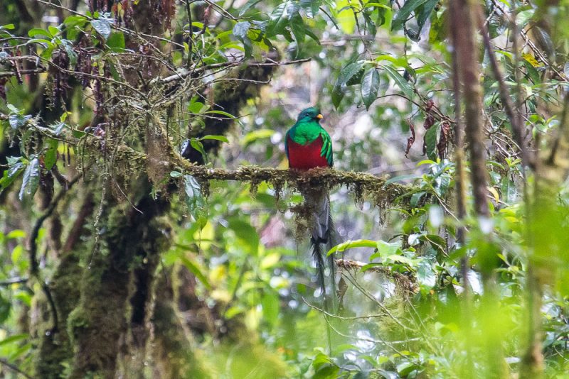 Nun, warum aber überhaupt im Regen über so eine Strasse fahren? Unser Ziel war der Quetzal. Jener wunderschöne farbenfrohe Vogel, der nur in den Nabelwäldern Zentralamerikals lebt ist durch die Zerstörung seines Lebensraumes stark gefährdet. Nur in wenigen, teils schwer zugänglichen (Schutz)Gebieten kann man ihn noch in seinem natürlichen Habitat beobachten. Schon zur Zeit der präkolumbischen Kulturen wurde der Quetzal einerseits als Gottheit verehrt und andererseits wegen seiner prachtvollen langen Schwanzfedern (die als Kopfschmuck für ihre Priester dienten) gejagt. Zwar wurde derjenige, der einen Quetzal tötete, mit dem Tode bestraft, allerdings half diese drakonische Strafe dem Vogel wenig, wenn es um die begehrten langen Oberschwanzdecken ging. Er wurde lebendig gefangen und jene Federn wurden ihm ausgerissen.