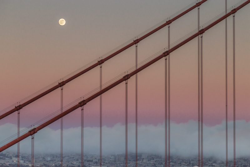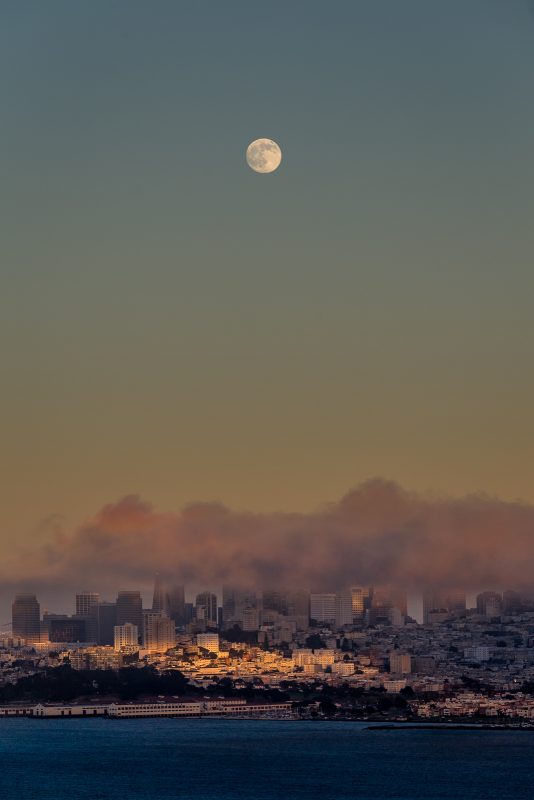 Auf unserem Weg lag natürlich auch das große Chinatown. Dort gönnten wir uns ein leckeres und günstiges Dim Sum Buffett. Dann mussten wir uns auch schon wieder beeilen, da im Laufe des Tages der Himmel aufgebrochen war und wir doch endlich einen Sonnenuntergang über der Brücke erleben wollten. Und siehe da: Was lange währt, wird endlich gut! Wir hatten nicht nur einen fabelhaften Sonnenuntergang, sondern auch noch einen kullerrunden schönen Vollmond über San Francisco! Mark hat bestimmt eine Stunde lang Fotos gemacht und das Ergebnis kann sich sehen lassen! 🙂