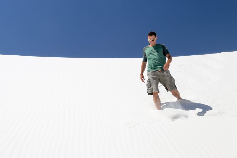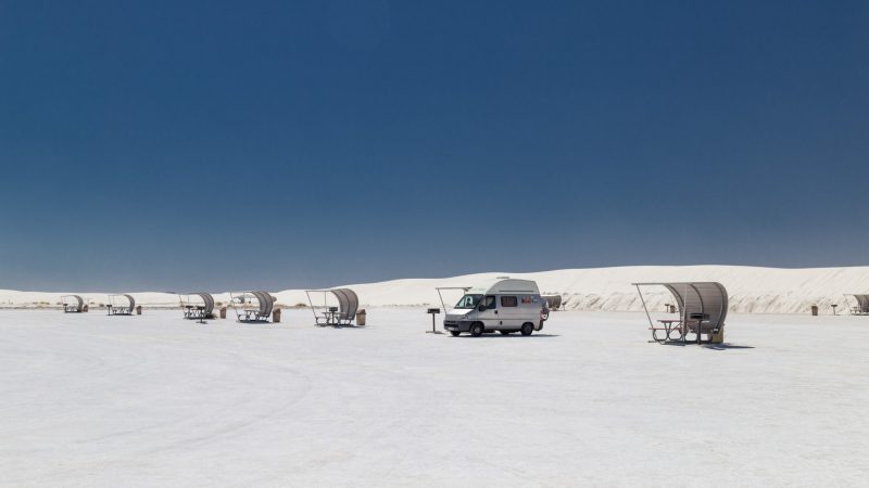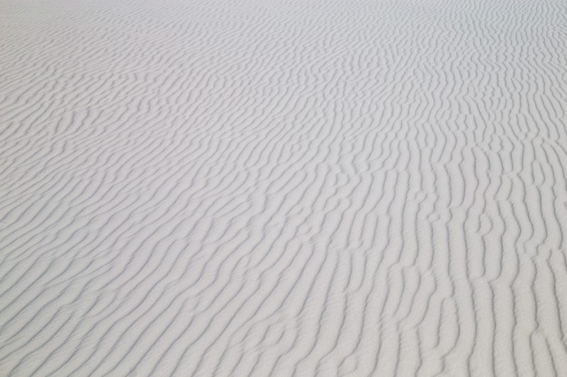Unglaublich aber wahr – weiße Sanddünen mitten in New Mexiko. Allerdings besteht der „Sand“ aus Gips-Partikeln. Diese werden vom Wind aus den abgelagerten Sedimenten des Lake Lucero von großen Kristallen zu Körnern erodiert und dann als Partikel zu den riesigen Dünen des White Sands National Monument verblasen.